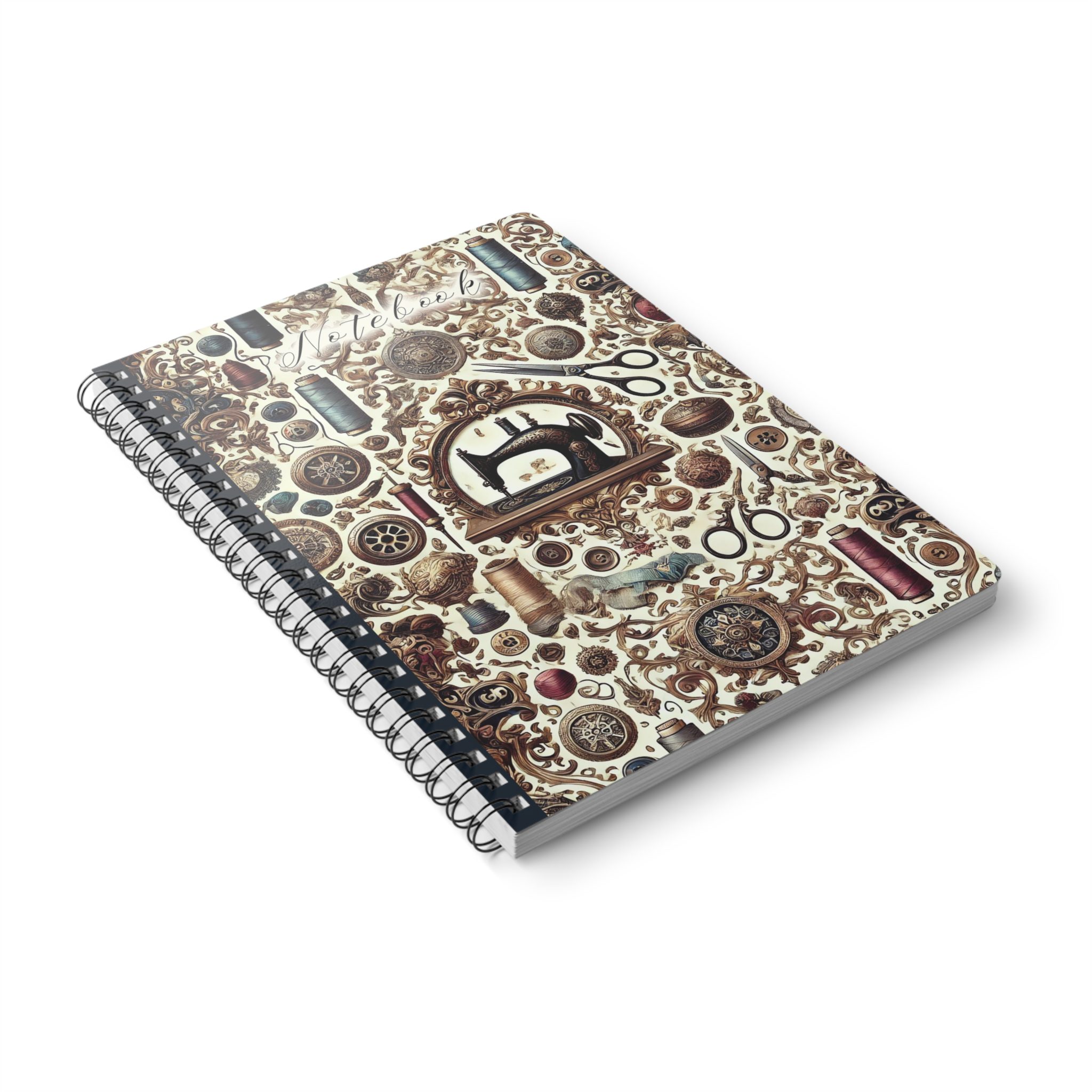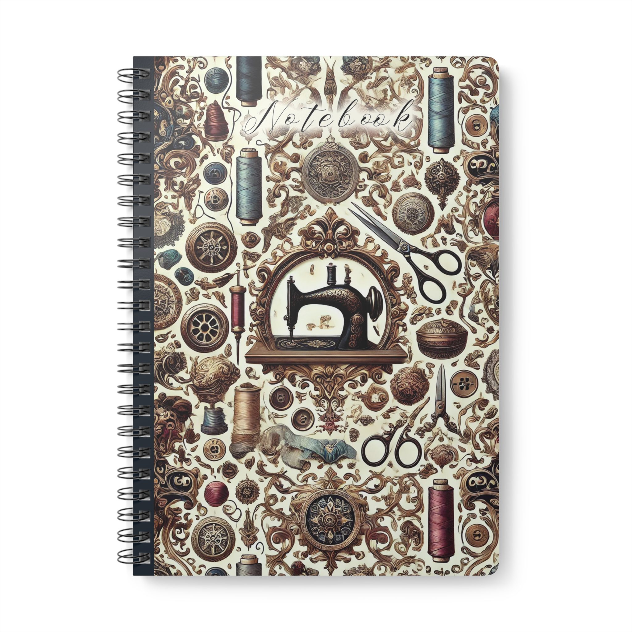 Elegant, timeless, and full of creative charm, this vintage sewing notebook brings classic craftsmanship to life. Featuring an ornate sewing machine framed by delicate scrollwork, golden threads, and antique embellishments, it’s a design that celebrates the beauty of sewing’s golden age. Perfect for quilters, sewists, and makers who appreciate artistry as much as precision, this notebook blends elegance and practicality in perfect harmony.