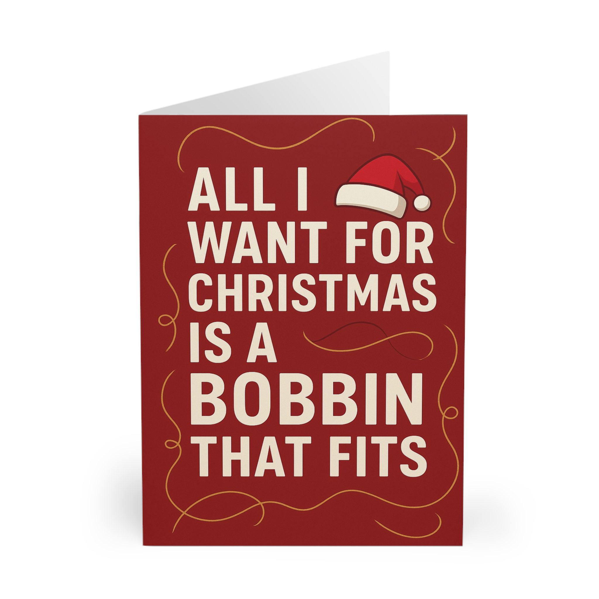 This Sewing Christmas Card is the perfect festive laugh for anyone who sews — because every sewist knows the struggle of bobbins that just won’t fit. With bold typography, a rich Christmas-red background, a cute Santa hat, and playful golden thread flourishes, this design delivers clean, modern sewing humour with a festive twist.