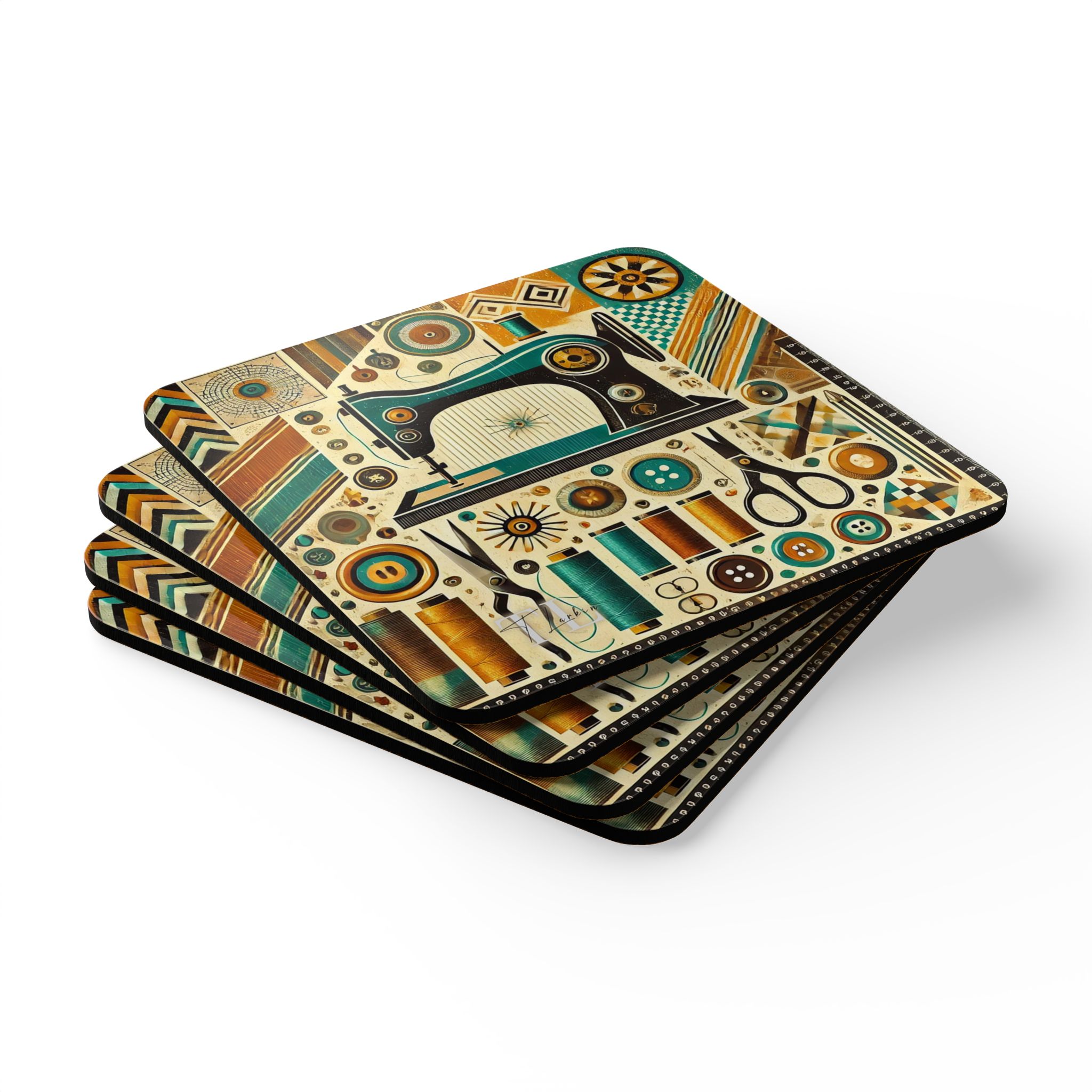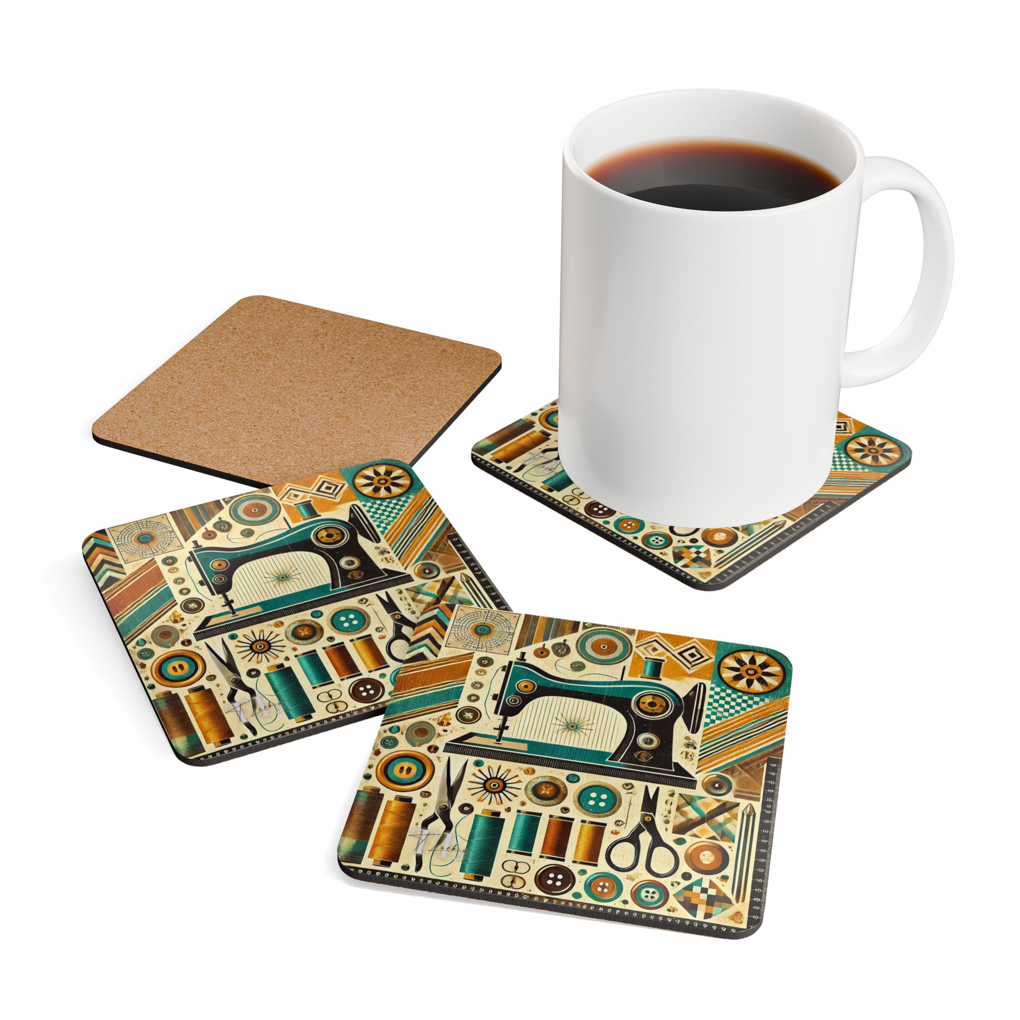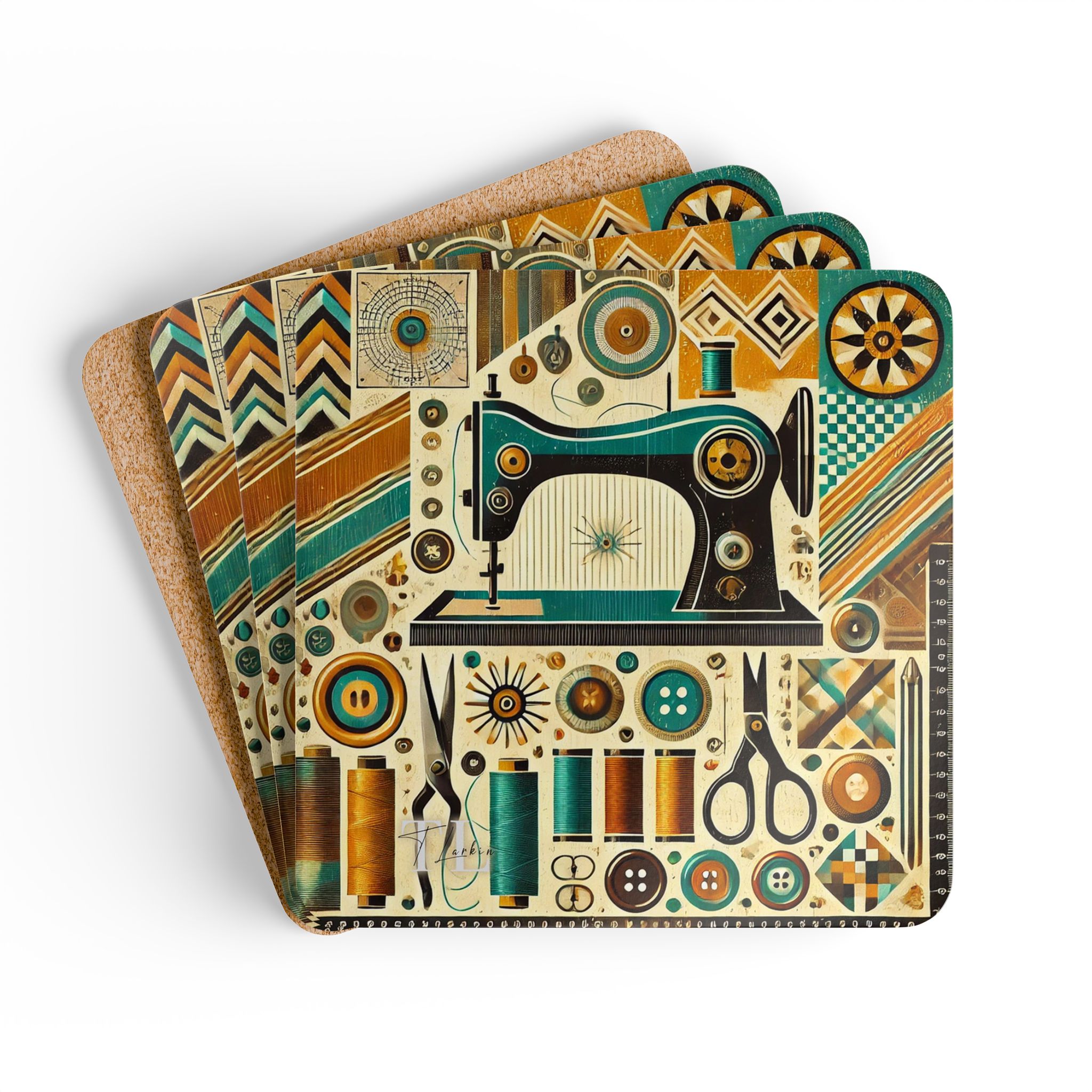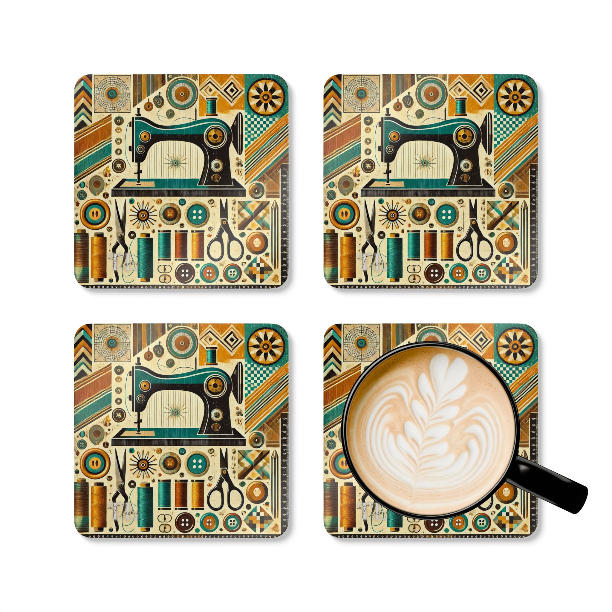 These Sewing Coasters bring a bold retro twist to traditional sewing themes, combining teal, mustard, and burnt orange geometric patterns with a stylised vintage sewing machine. Perfect for sewists who love colourful, modern-meets-vintage décor, this set of four adds instant personality to your craft room, sewing station, or cosy corner at home. Whether catching drips during a busy stitching session or adding a pop of colour to your creative space, these Sewing Coasters deliver both style and practicality. The glossy MDF finish keeps every detail crisp and vibrant, while the cork backing ensures each coaster stays firmly in place.