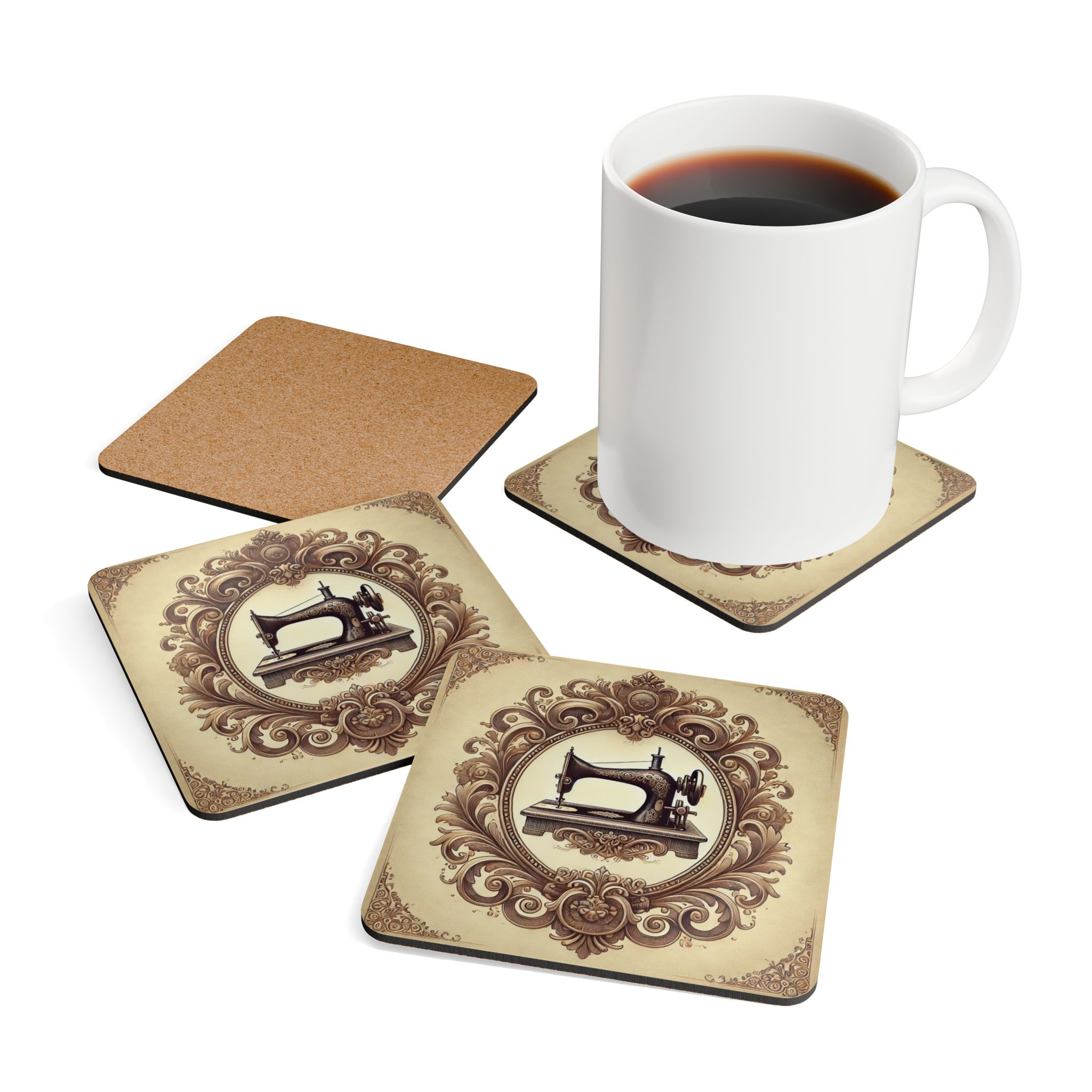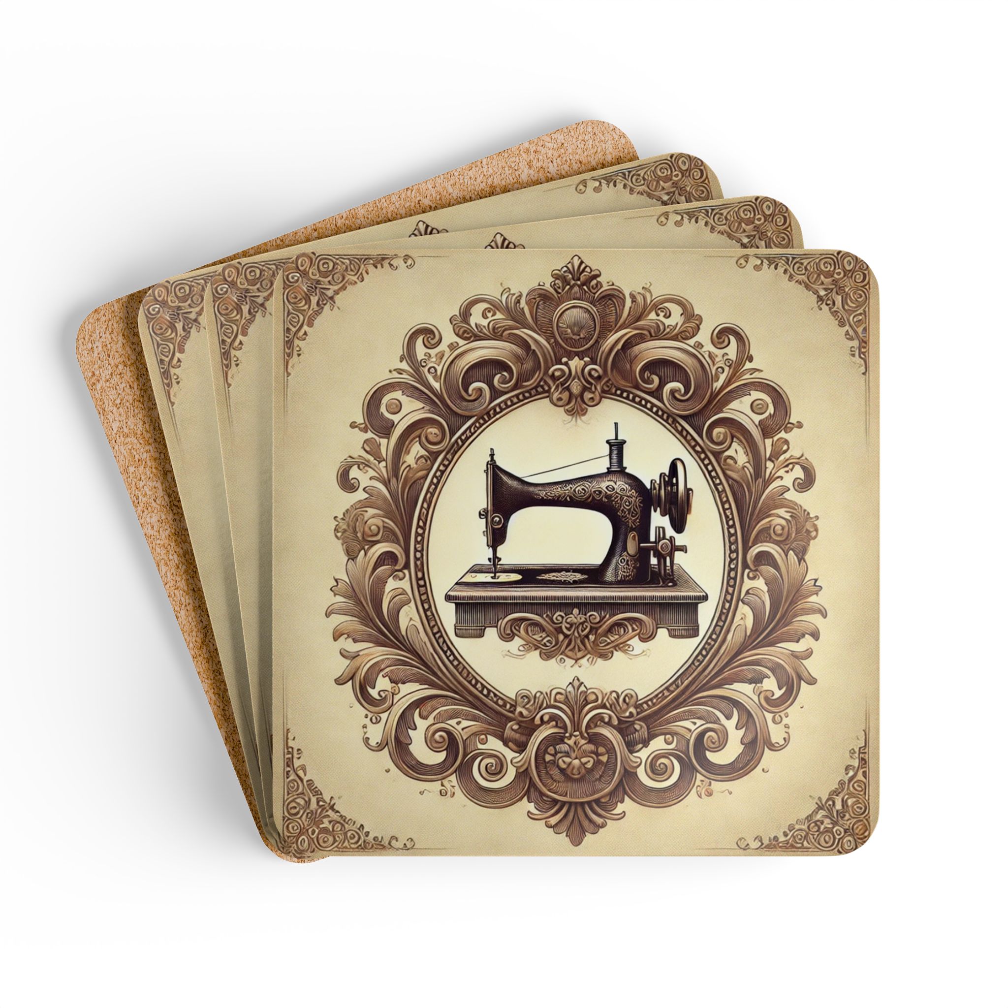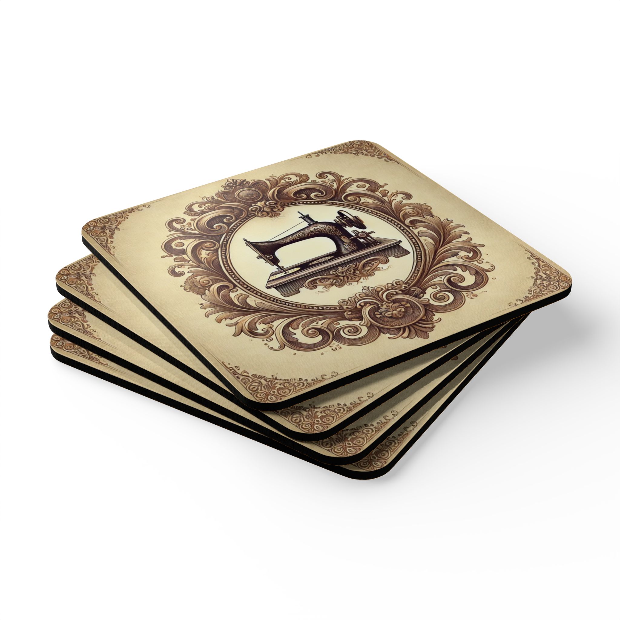 These Sewing Coasters bring warm, vintage charm to any crafting space, sewing room, or cosy corner of your home. Featuring an ornate antique sewing-machine motif framed with rich sepia flourishes, this set of four adds both function and nostalgia to your daily routine. Whether resting under a mug of tea during a late-night stitching session or protecting your craft table while you work, these Sewing Coasters offer beauty, practicality, and a touch of old-world elegance. Their glossy MDF tops keep colours crisp and easy to clean, while the cork backing ensures they stay firmly in place — perfect for makers who love surrounding themselves with objects that whisper stories of handmade tradition.