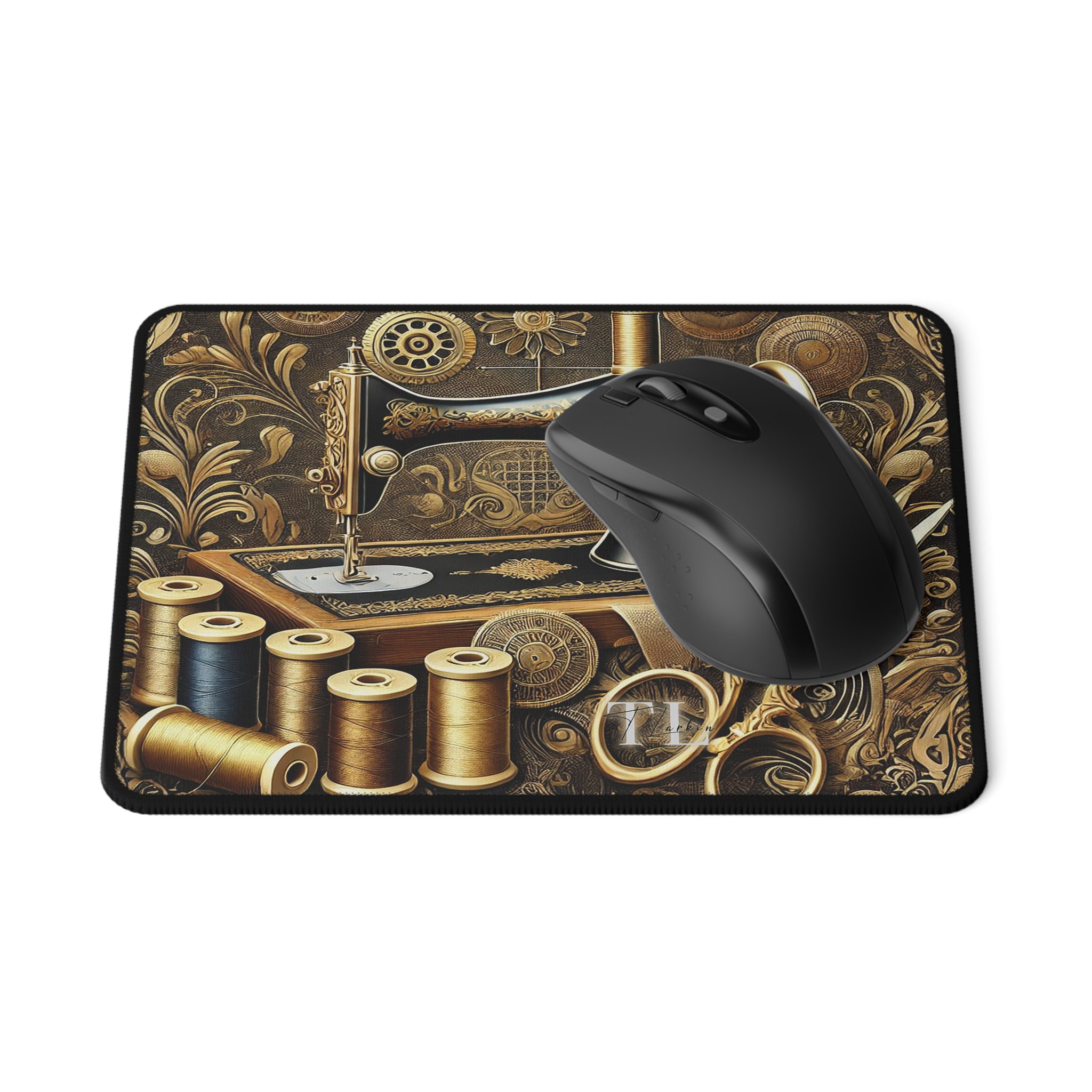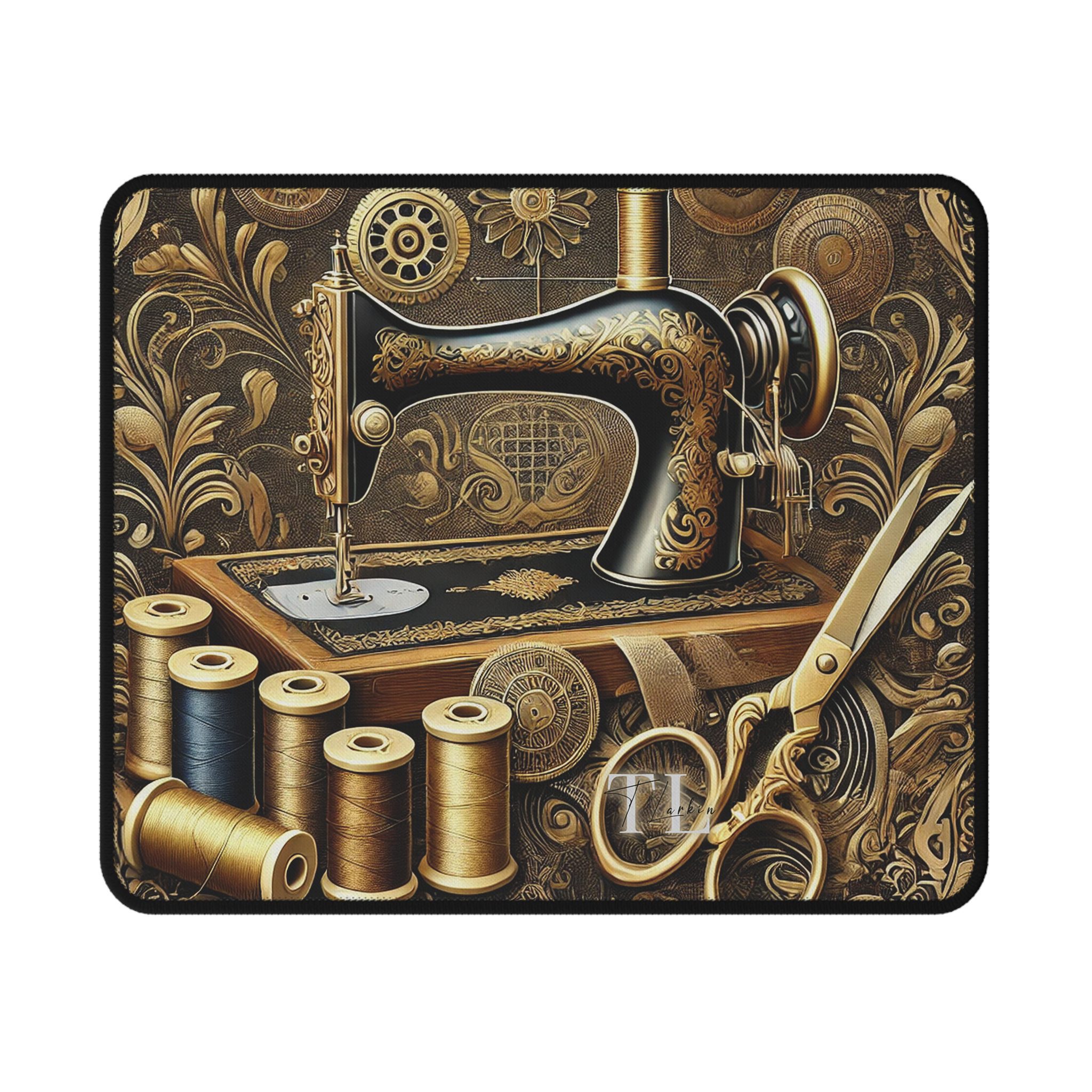 Elevate your workspace with this Sewing Mouse Mat, a stunning gold-on-black design that exudes elegance and craftsmanship. Featuring a beautifully ornate sewing machine surrounded by golden scissors, thread spools, and intricate floral motifs, it captures the timeless glamour of vintage sewing in exquisite detail.