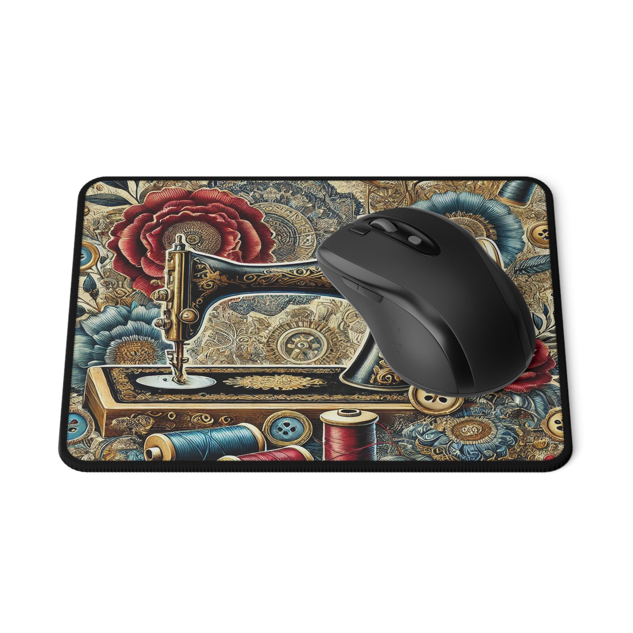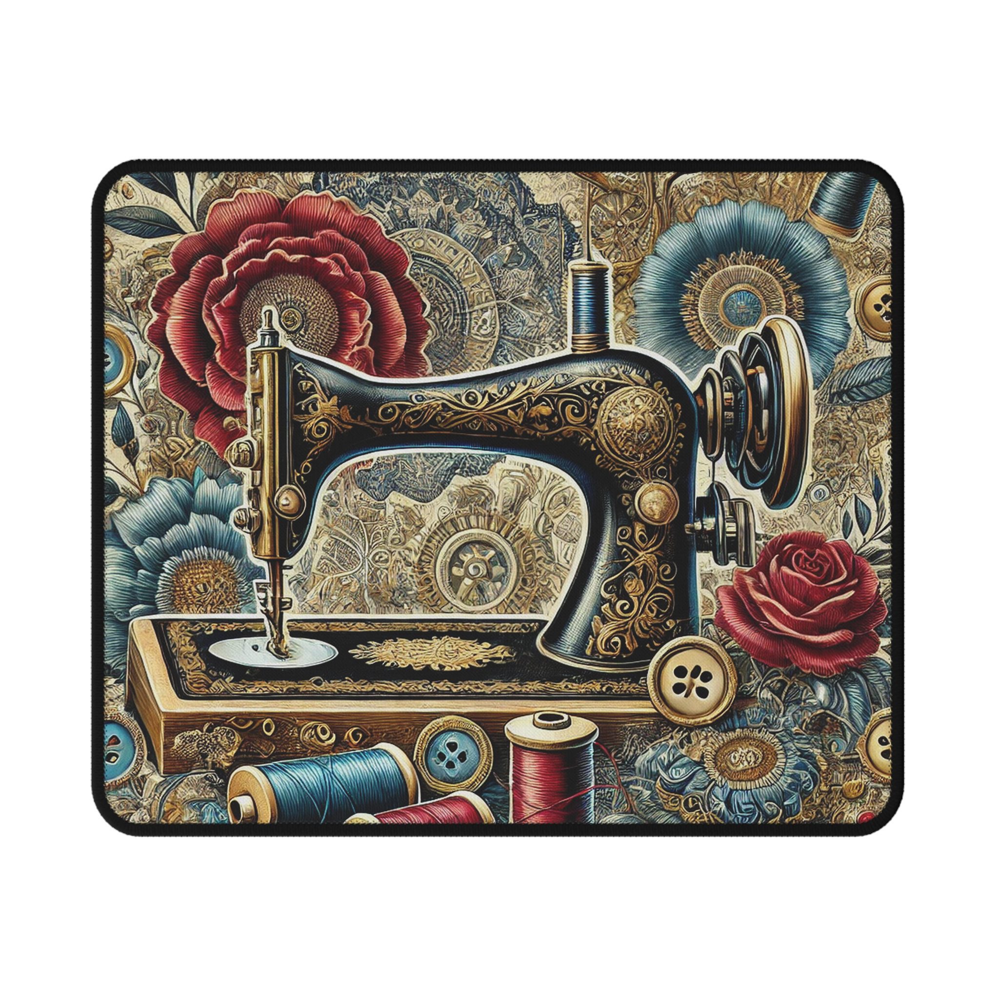 Bring vibrant artistry to your workspace with this Sewing Mouse Mat, featuring a beautifully ornate sewing machine surrounded by lush floral patterns and vintage sewing details. Deep reds, rich blues, and antique golds combine to create a bold, luxurious design that celebrates the creative soul of every maker.