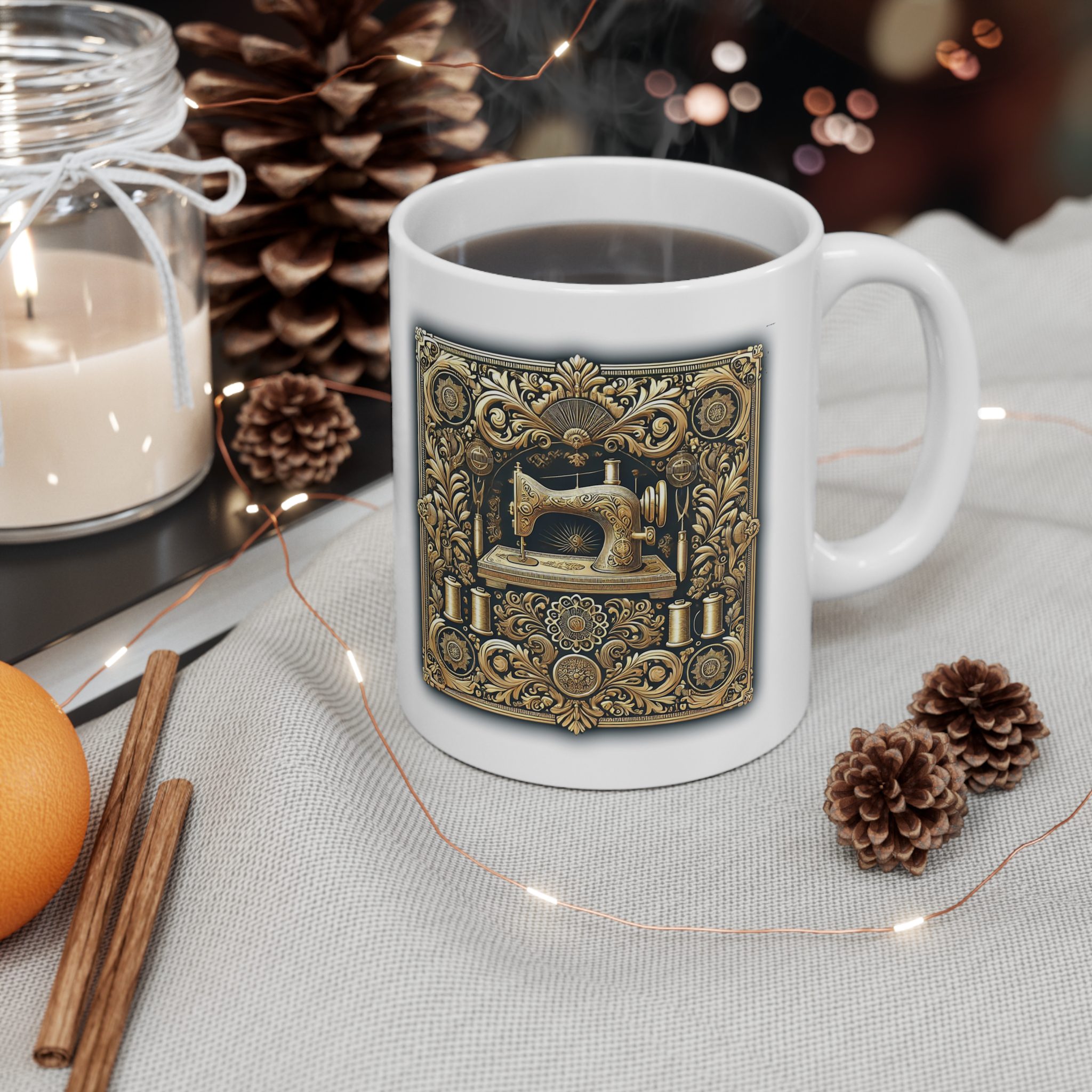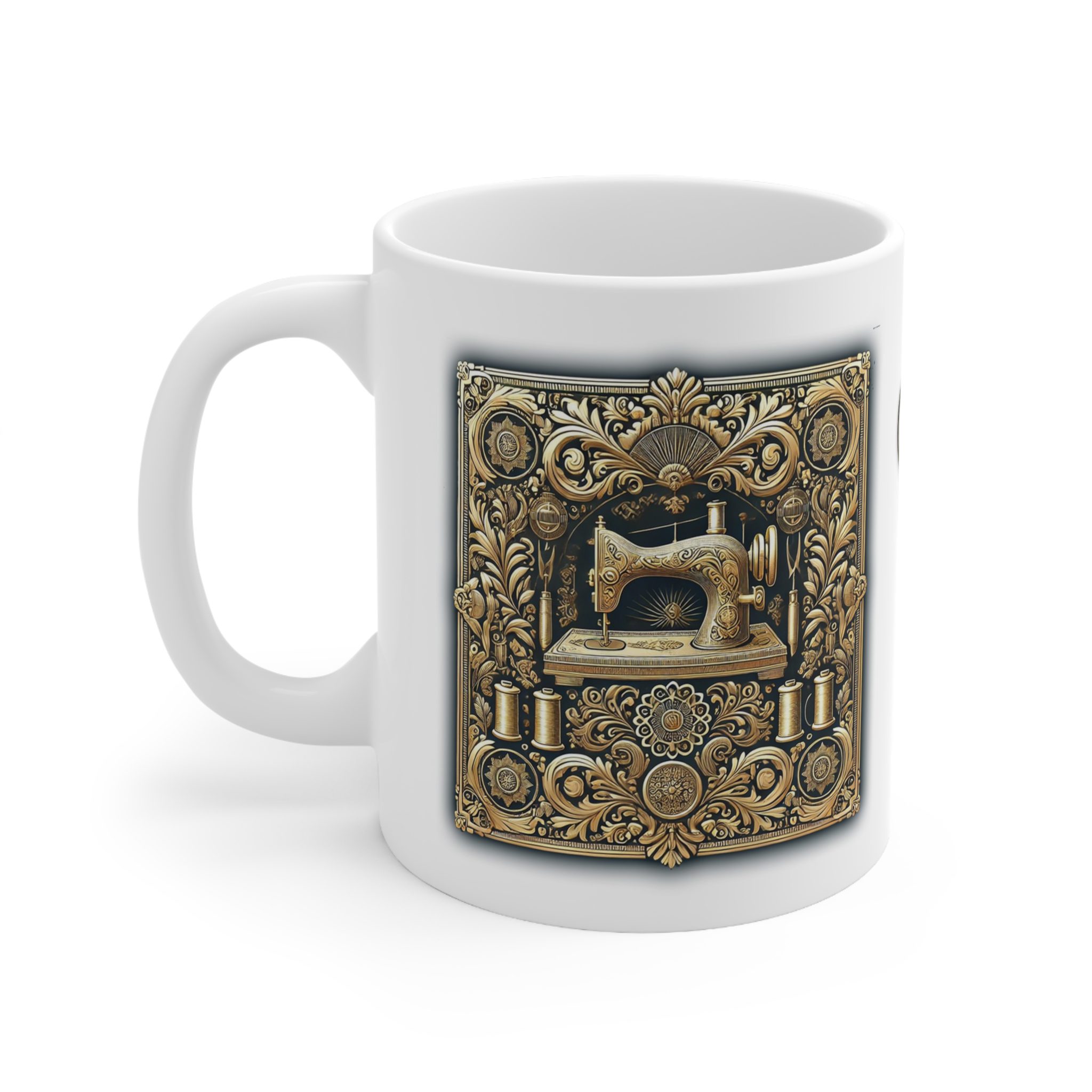 This Sewing Mug brings a touch of pure luxury to your daily coffee or tea. Featuring an intricate gold illustration of a vintage sewing machine framed by elaborate scrollwork, spools, and filigree, it captures the opulence and artistry of classic sewing heritage.