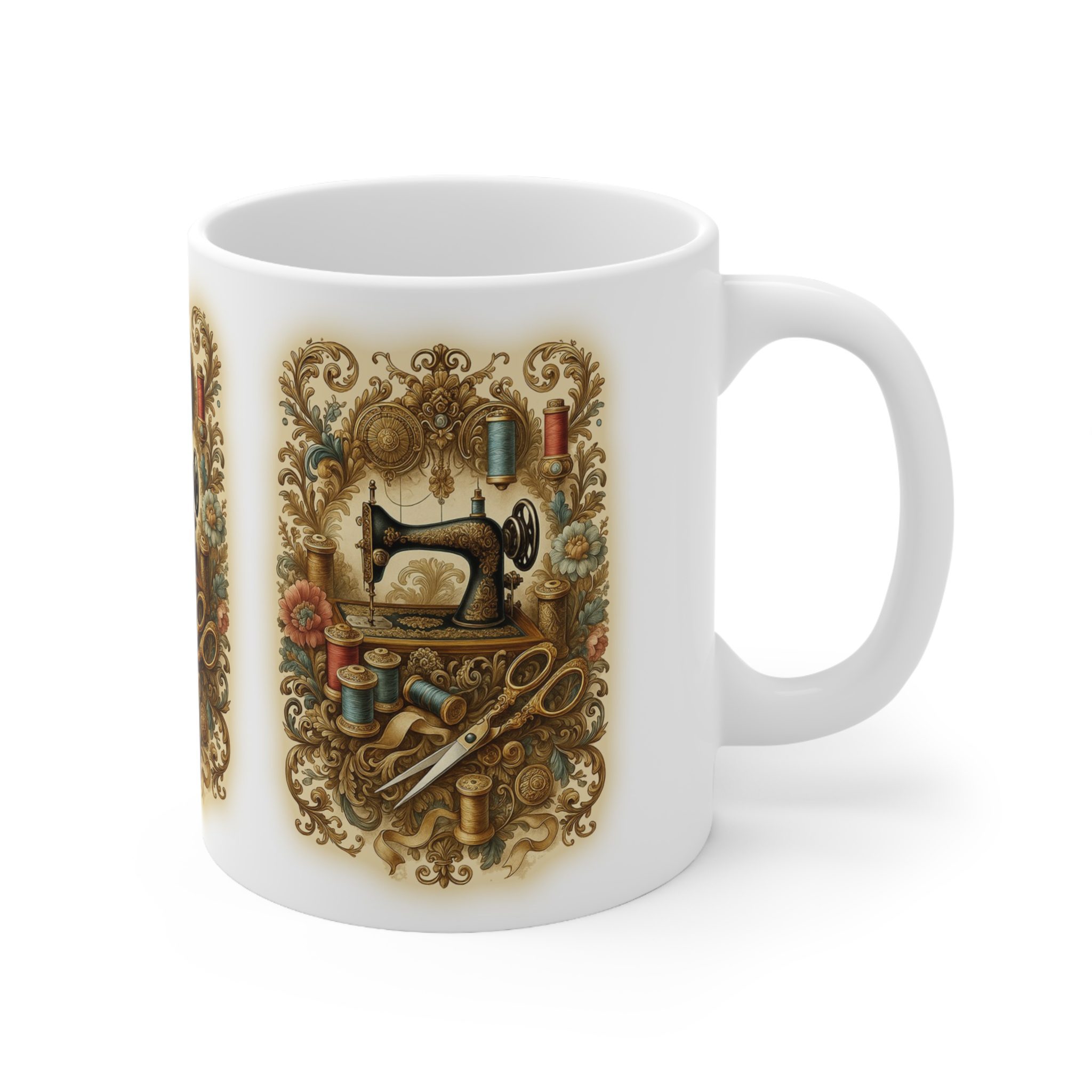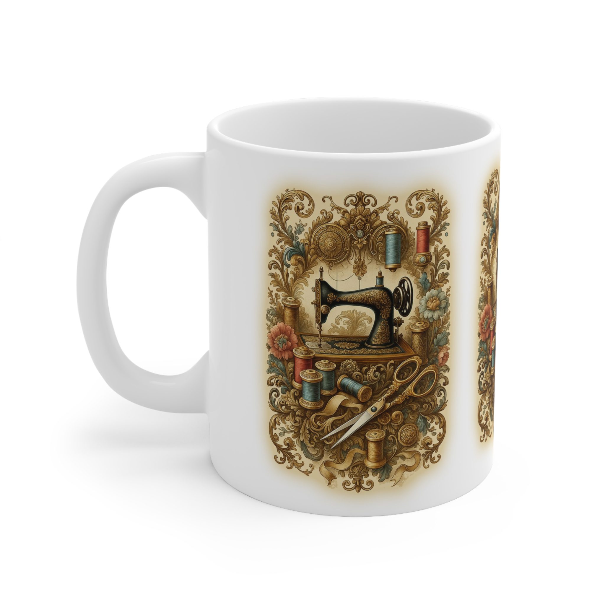 This Sewing Mug captures the timeless elegance of classic craftsmanship. Featuring an ornate vintage sewing machine surrounded by golden filigree, spools of thread, scissors, and delicate floral accents, it’s a stunning tribute to the art of sewing in its most beautiful form.