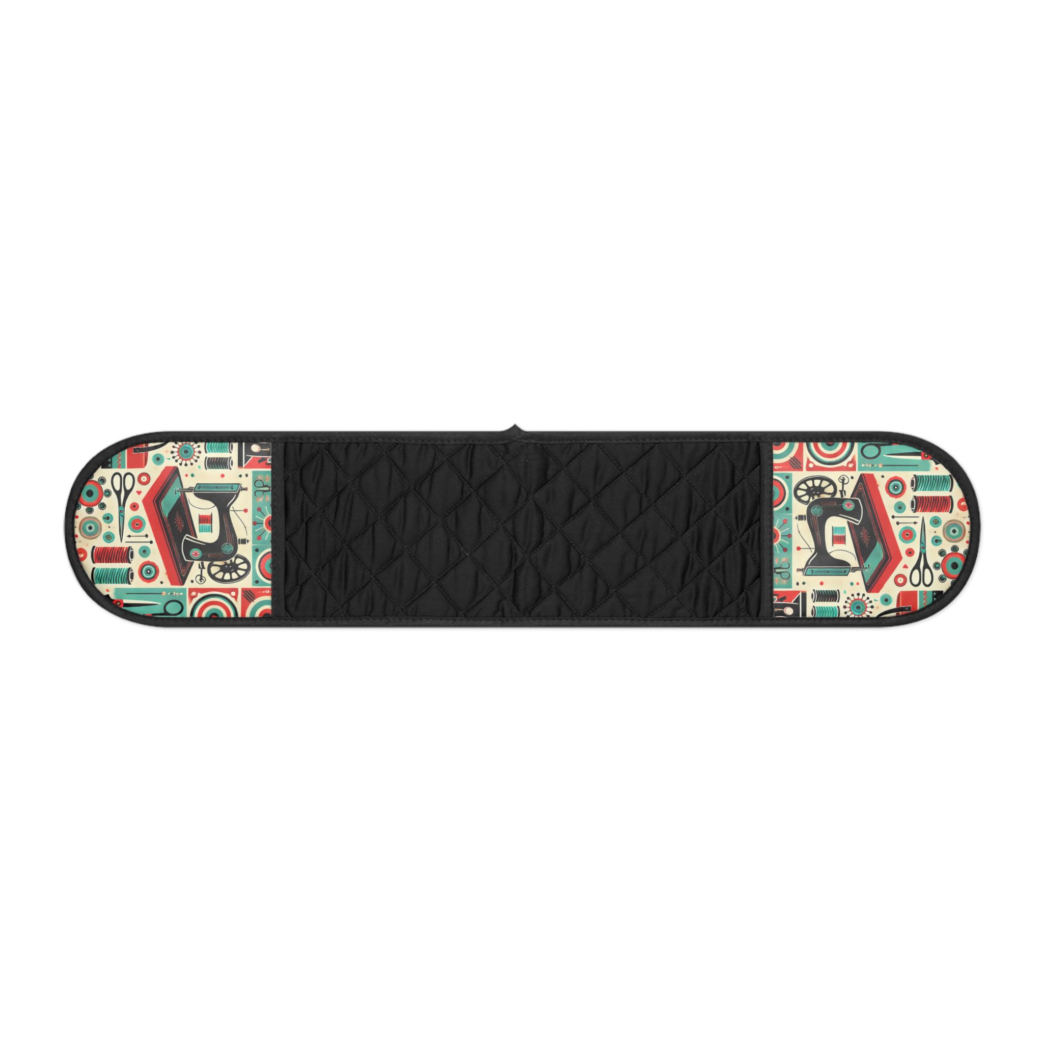 These Sewing Oven Mitts are bursting with retro charm, featuring a bold teal-and-red sewing machine pattern mixed with classic sewing notions like thread spools, buttons, scissors, and gears. The playful mid-century colour palette gives these mitts a bright, cheerful personality — perfect for sewists who love vintage style with a fun, modern twist. Whether you’re baking treats or serving dinner, these heat-insulated mitts protect your hands while showing off your creative side.