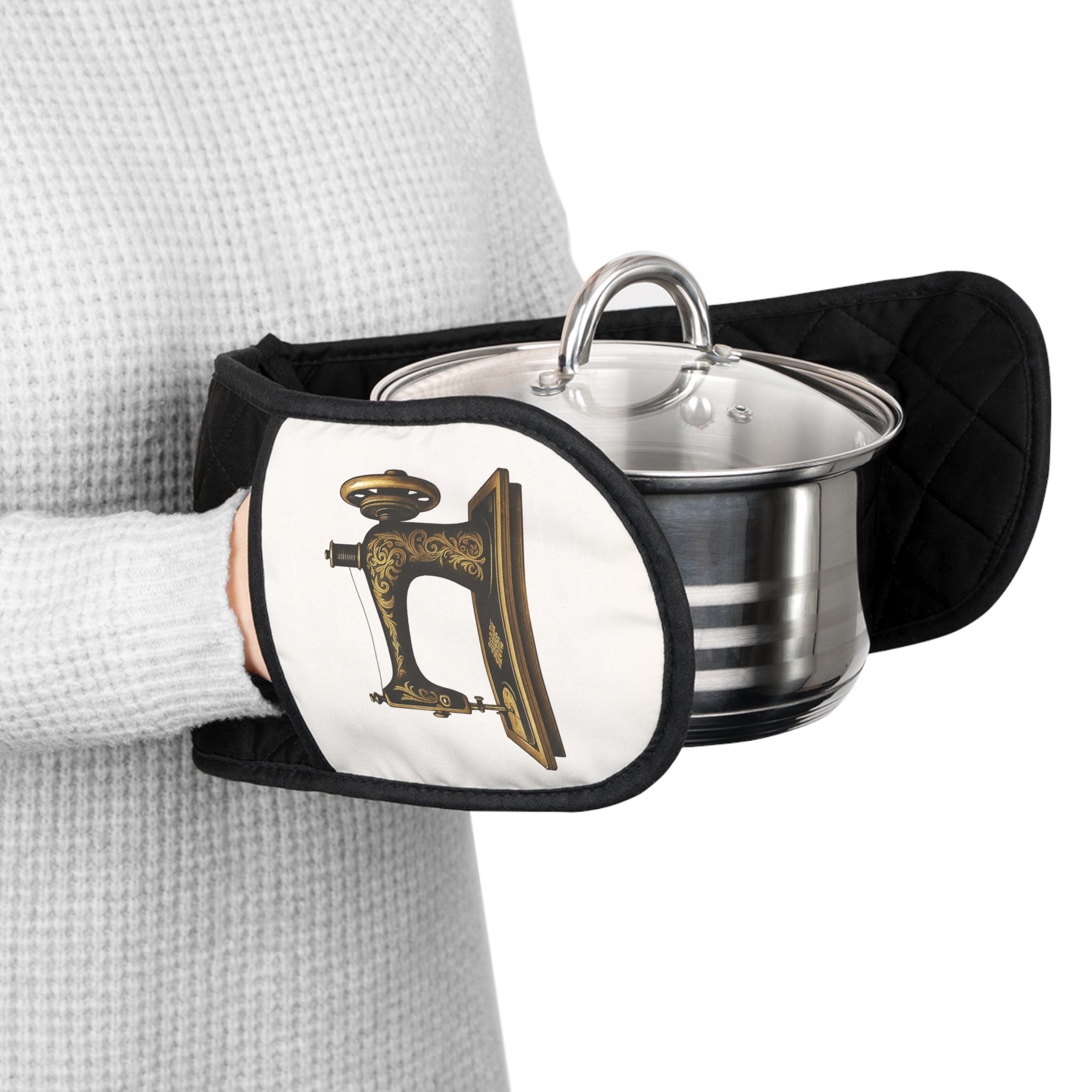 These Sewing Oven Mitts are perfect for sewists who love a clean, elegant aesthetic with a touch of classic vintage charm. Featuring a beautifully detailed gold antique sewing machine on a crisp white background, this design feels bright, modern, and timeless all at once. Whether you’re baking, roasting, or cooking up family favourites, these heat-insulated mitts protect your hands while showing off your passion for stitching.
