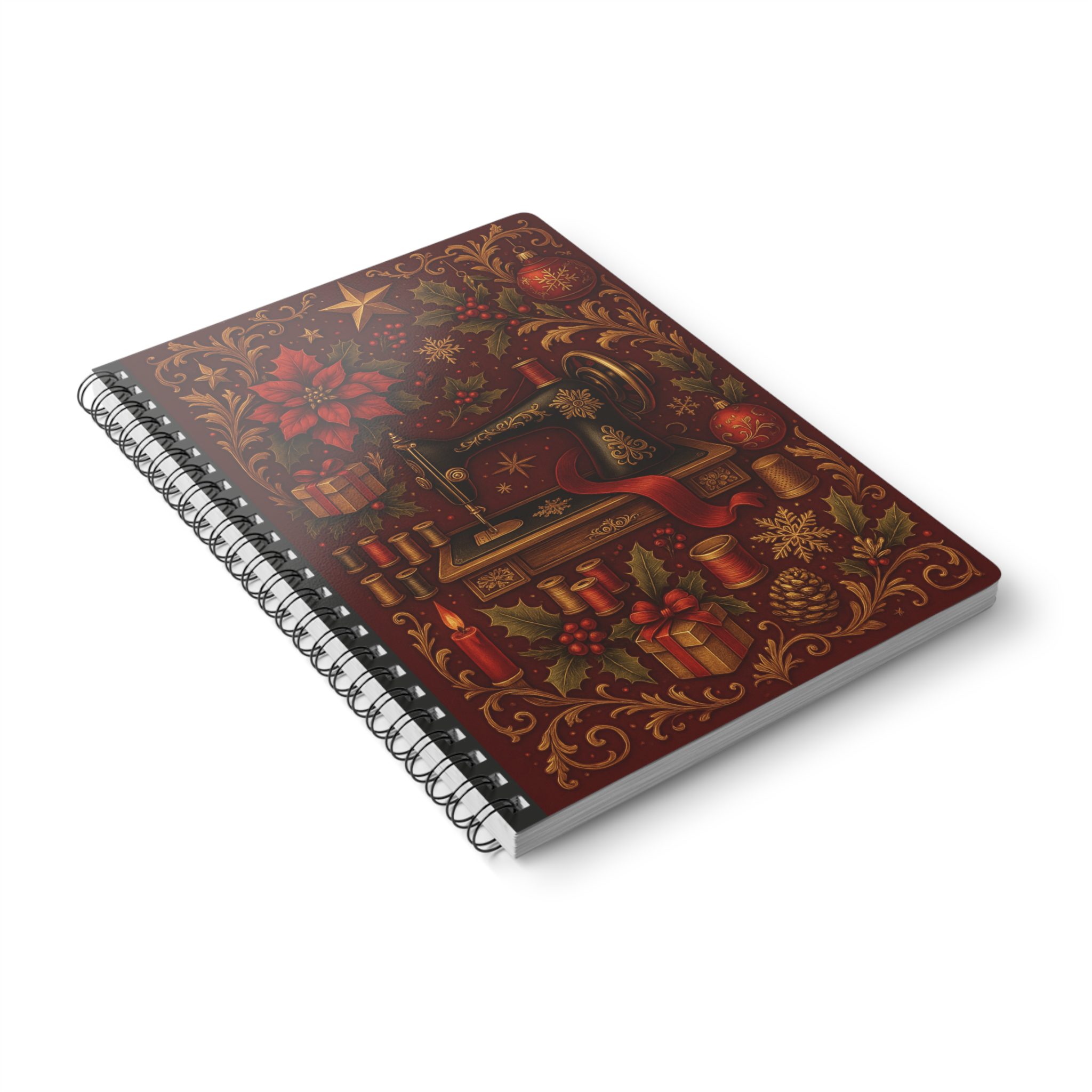 Capture the charm of a bygone era with this Christmas sewing notebook, featuring a classic black vintage sewing machine surrounded by poinsettias, holly, ornaments, and golden accents. Perfect for jotting down handmade project ideas, festive quilt patterns, or holiday to-do lists, this funny sewing journal combines timeless style with seasonal warmth — the ideal gift for sewing lovers this Christmas.